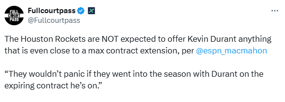 今年休赛期,杜兰特在火箭、太阳、湖人、勇士等七队交易中被太阳送到火箭,新赛季他将身穿火箭7号球衣,杜兰特的加盟让火箭成为夺冠热门,不过火箭预计不会给杜兰特顶薪续约合同,据名记Tim MacMahon报道,火箭预计不会为凯文-杜兰特提供任何接近顶薪的续约合同,火箭并不急于与杜兰特展开有关续约的谈判,如果杜兰特带着现有的合同进入新赛季,火箭也不会感到恐慌。